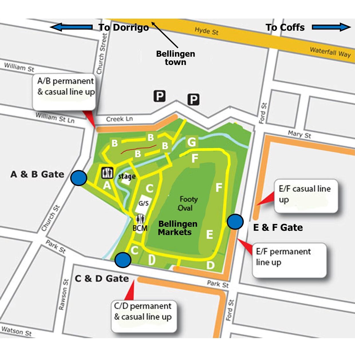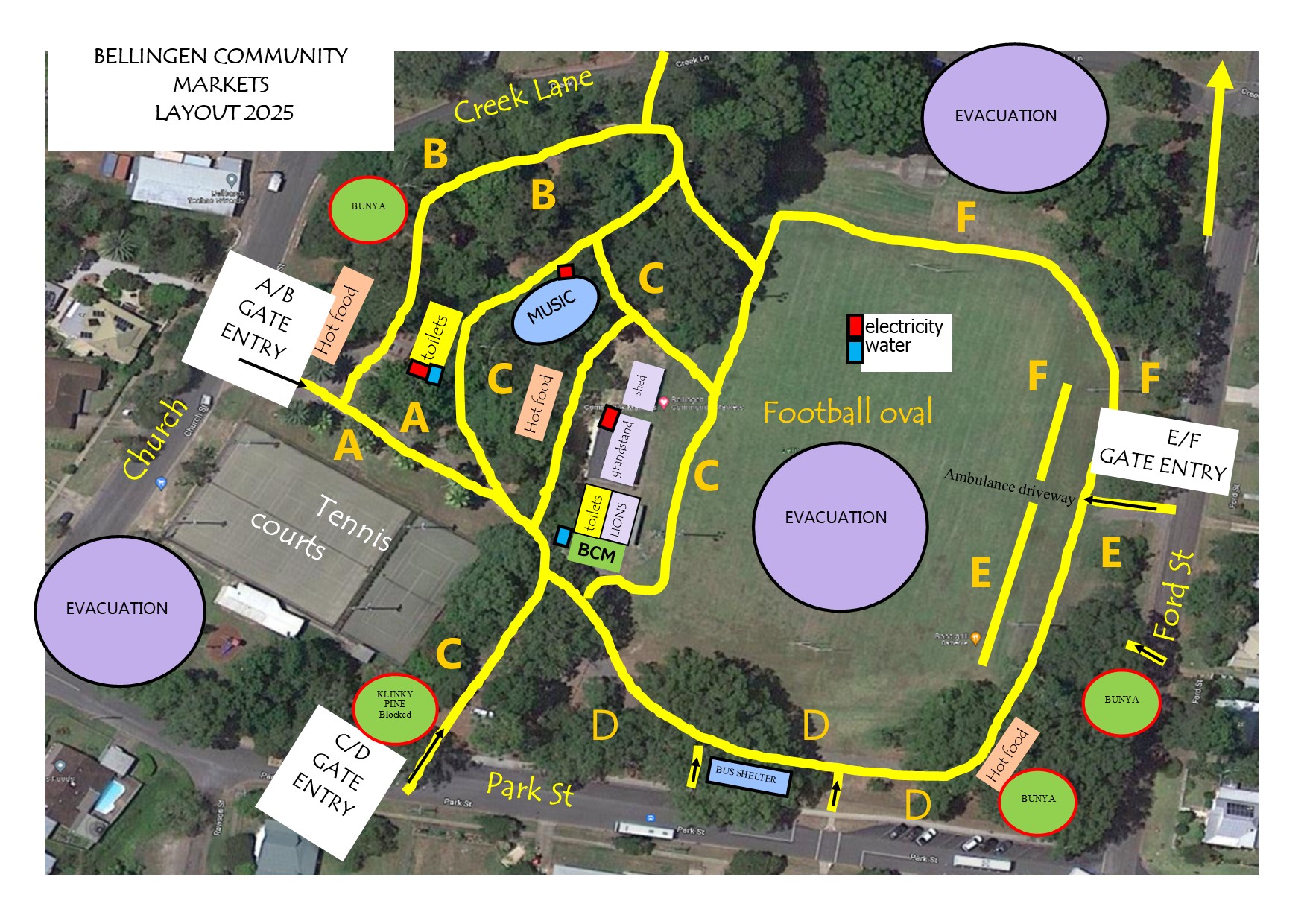The below map is of our market at Bellingen Park. It shows where everything is including our three evacuation points. The one at the back of the Memorial Hall cannot be accessed via F section as the bridge has gone. Access Memorial Hall from B section Creek Lane or Ford Street.